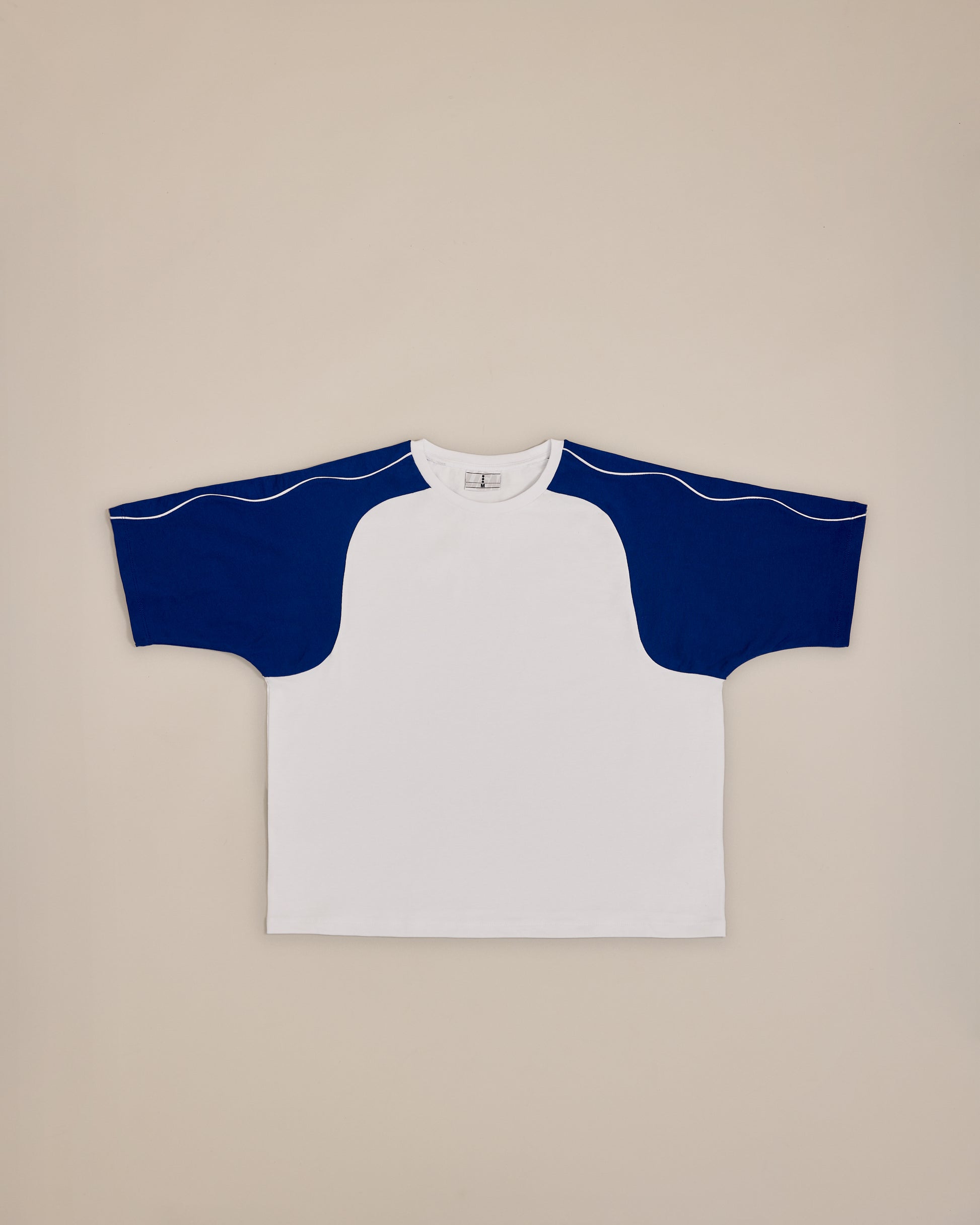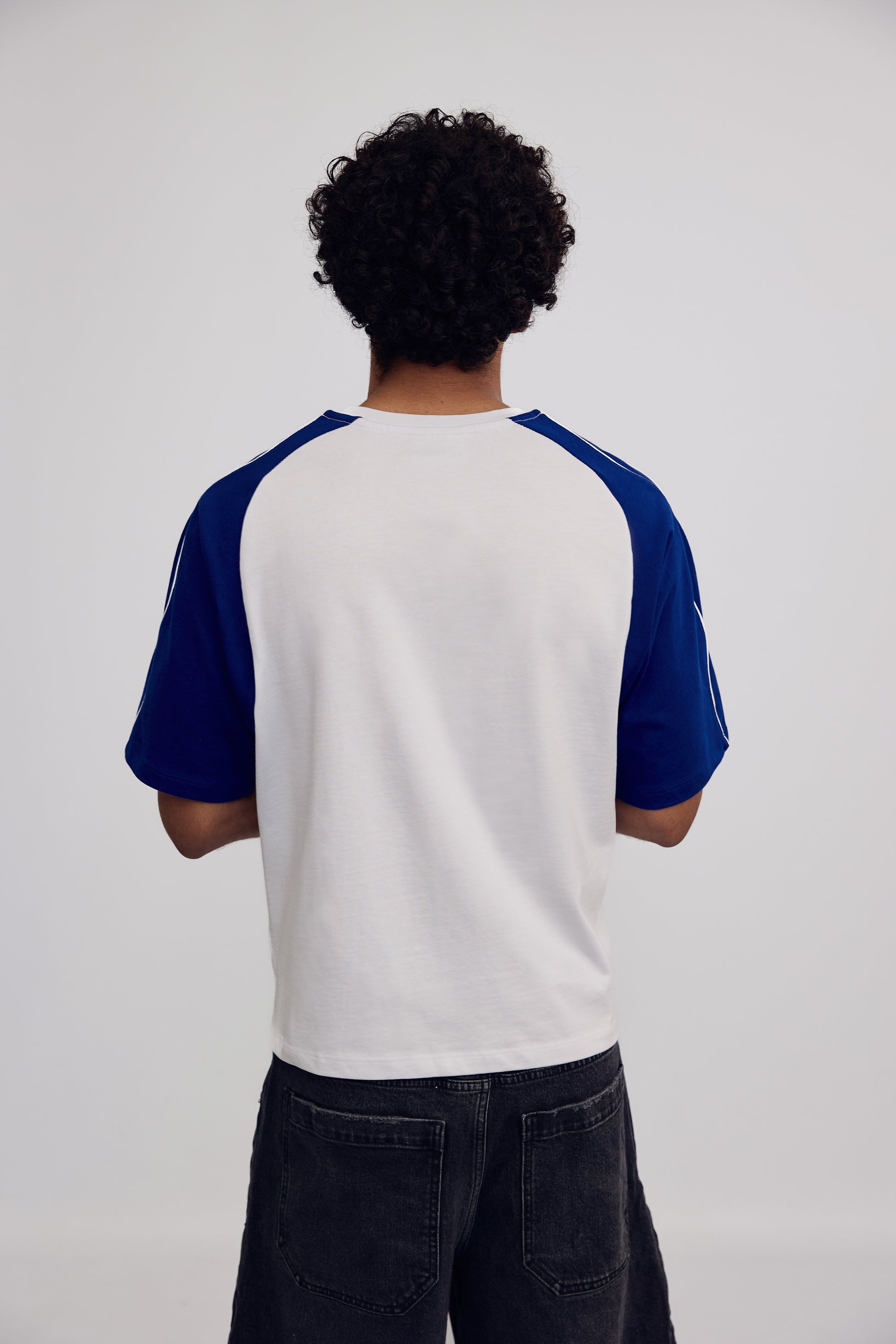 The Wave Raglan Tshirt in navy blue and white features subtle white piping along the sleeves and a classic raglan cut.